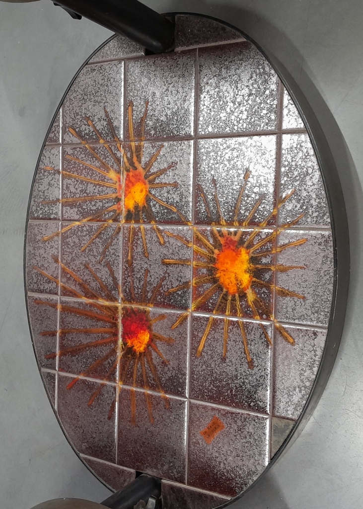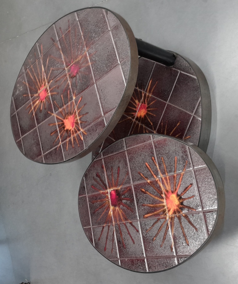 LA ROUE - VALLAURIS - Table basse en acier et carreaux de céramique à trois plateaux ovales dont deux mobiles