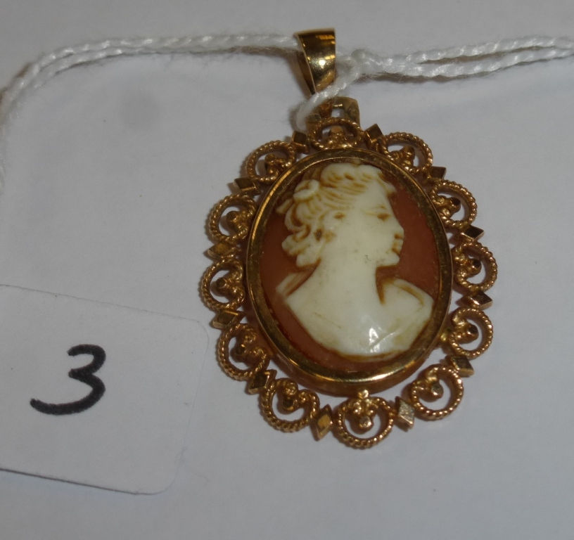 Pendentif en or jaune 18k à décor ajouré de coeurs et de losanges, orné en son centre d'un camée sur coquillage à décor d'un profil de jeune femme. PB: 4,2 gr