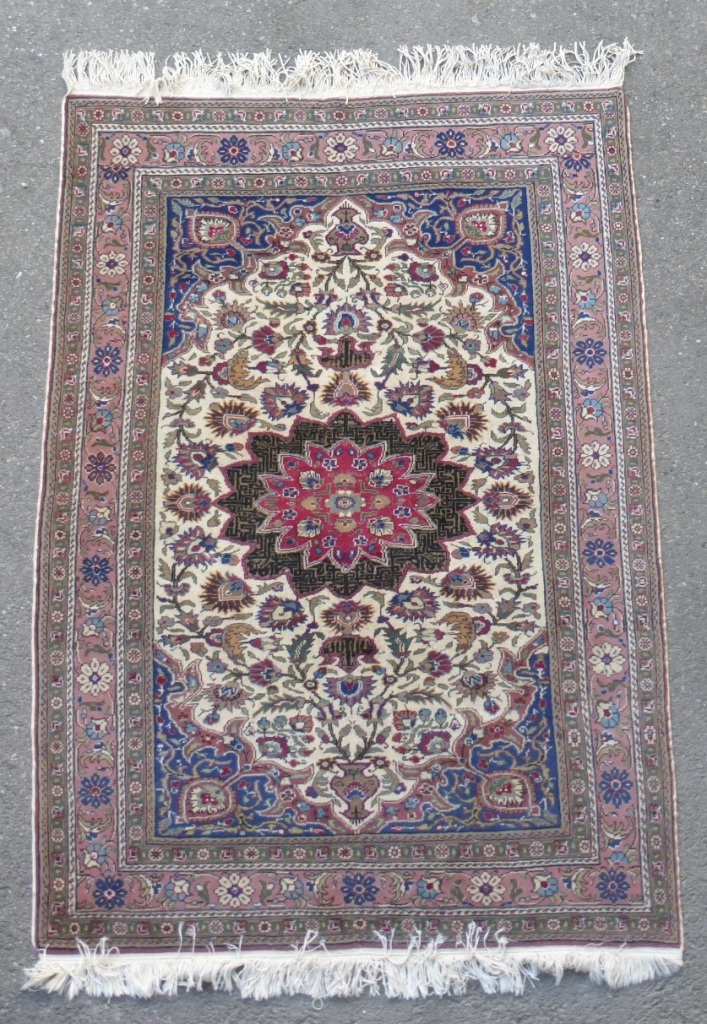 Tapis en laine à décor d'un médaillon central feuillagé entouré de rinceaux. Bordure crème 157 x 109 cm
