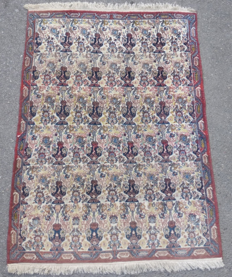 Tapis en laine à décor de vases et oiseaux sur fond crème. Bordure rouge 150 x 108 cm