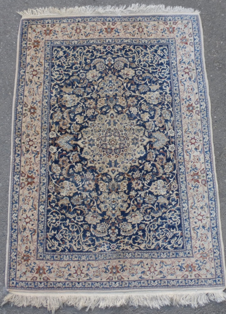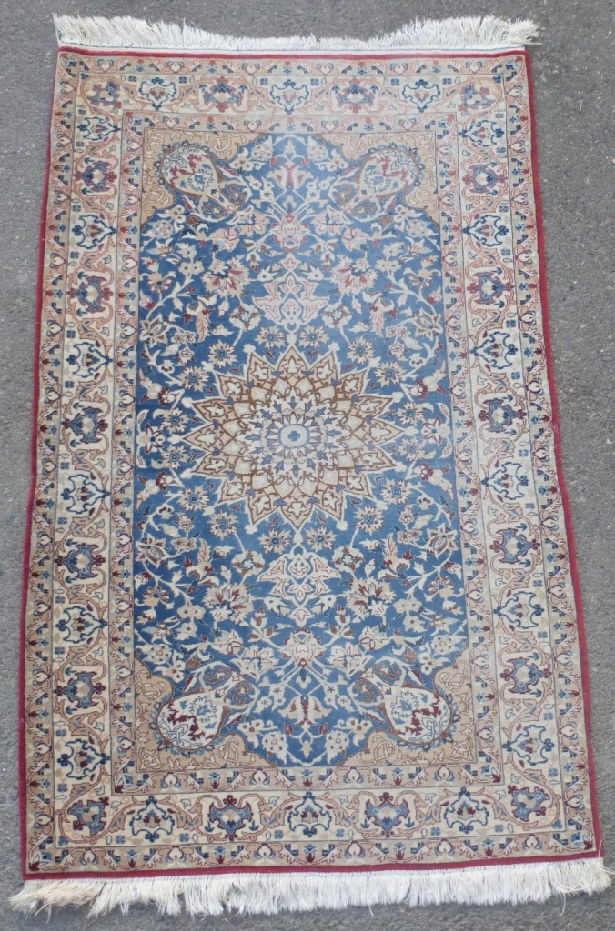 Tapis en laine à décor d'étoiles et rinceaux feuillagés sur fond bleu. Bordure crème (insolé) 131 x 83 cm
