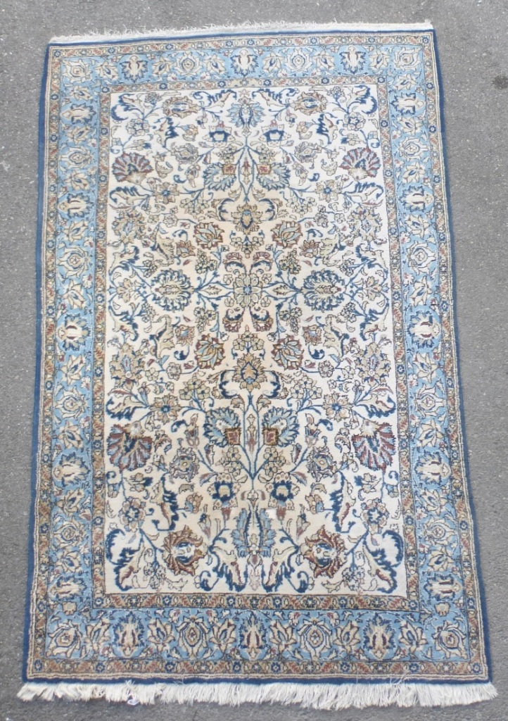 Tapis en laine à décor d'un vase d'où s'échappe l'arbre de vie sur fond crème. Bordure bleue. 231 x 142 cm