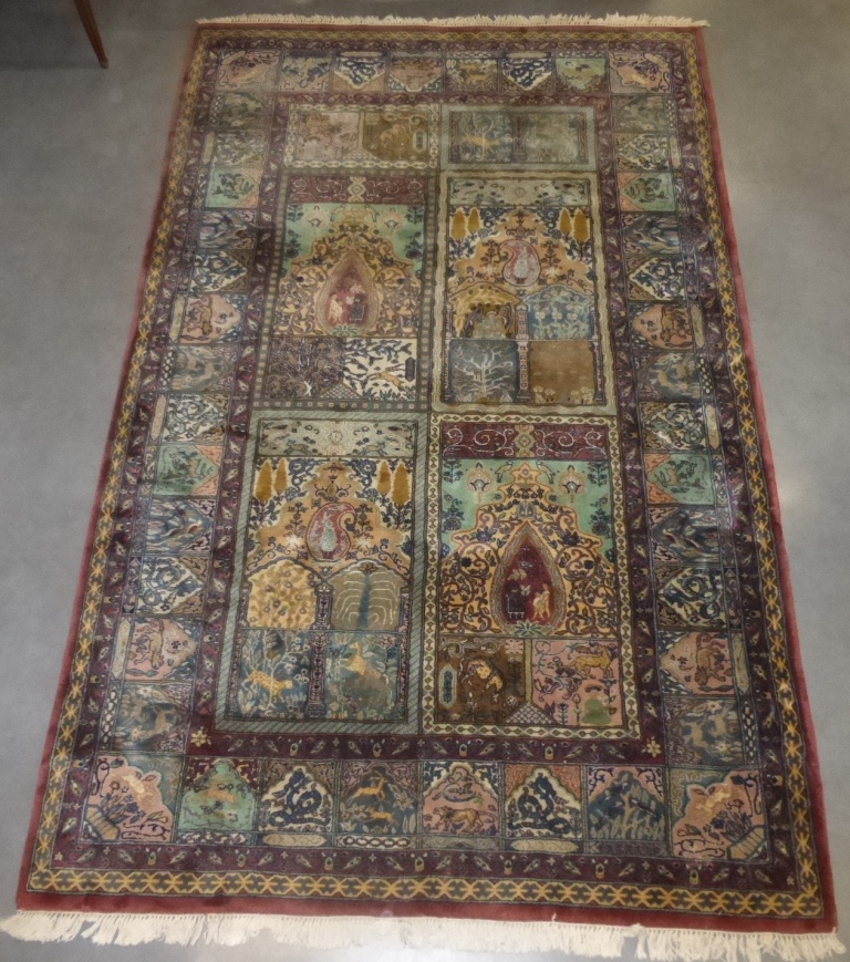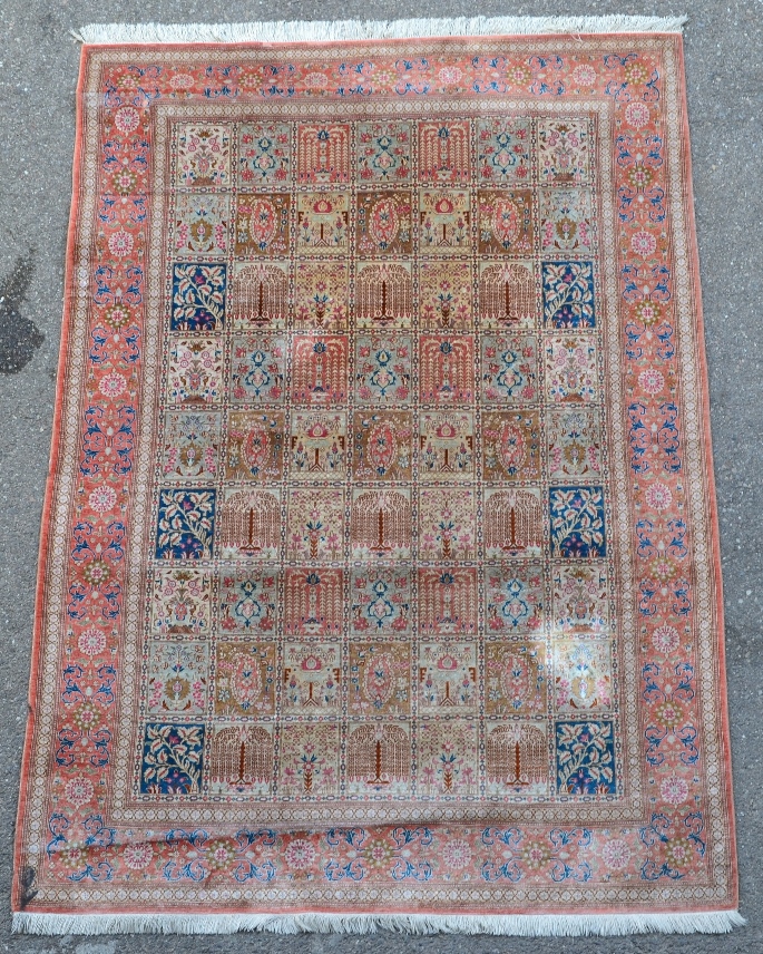 IRAN - GHOUM - Tapis Jardin en laine et soie à fond rose. 194 x 130 cm