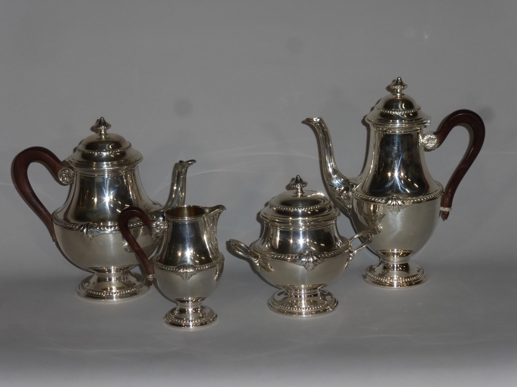 Service à thé et café quatre pièces en argent à décor de rangs de perles et agrafes. Manches en ébène. Il comprend une cafetière, une théière, un pot à crème, un sucrier. Maître orfèvre : G.B (avec un lion) PB : 1630 gr