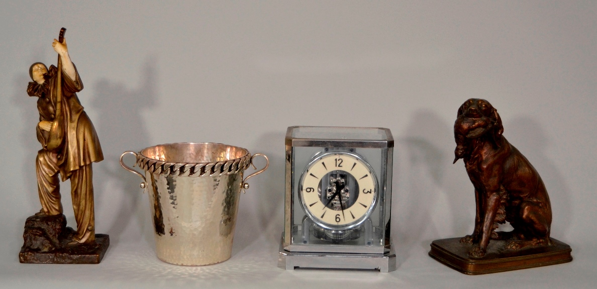Déméter CHIPARUS « Pierrot à la Cythare » - Jean DESPRES Seau à champagne – JAEGER-LECOULTRE Pendule ATMOS V - Ferdinand PAUTROT « Chien tenant un gibier »