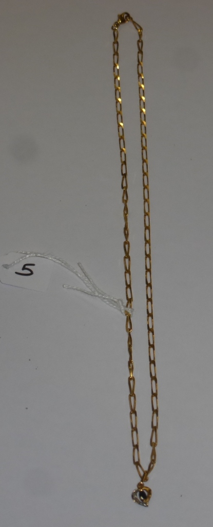 Chaîne et pendentif en or jaune 18k à larges mailles cheval et un petit pendentif coeur serti de pierres. L. 45 cm - Poids: 6,8 gr