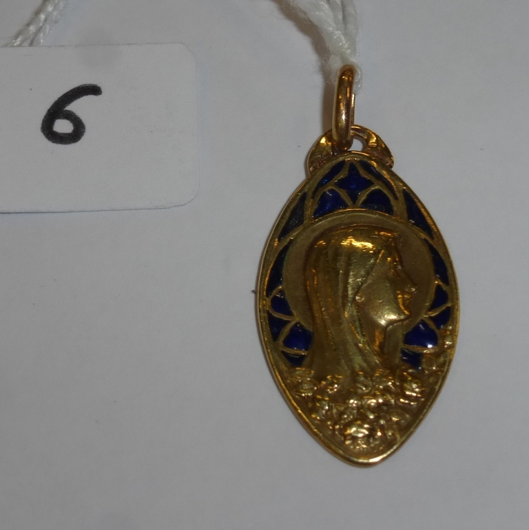 Médaille ovale en or jaune 18k et émail à décor de la Vierge et monogrammé au revers C.P 1925 PB: 4,7 gr
