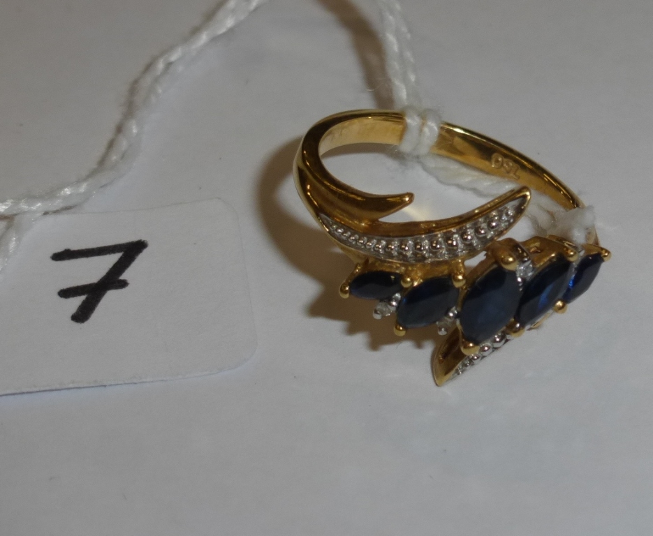 Bague en or jaune 18k sertie de cinq saphirs et et petits diamants. TDD : 52 mm - PB : 3,8 gr