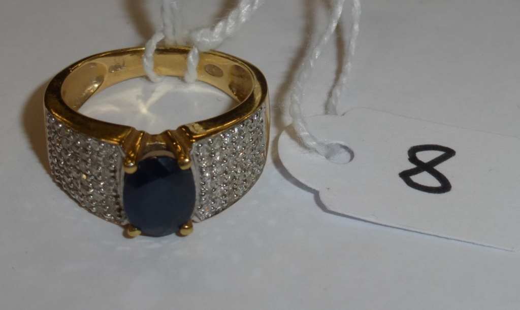 Bague en or jaune 18k, orné d'un saphir ovale. Côtés pavés de petits diamants. TDD: 53,5 mm - PB: 3,8 gr