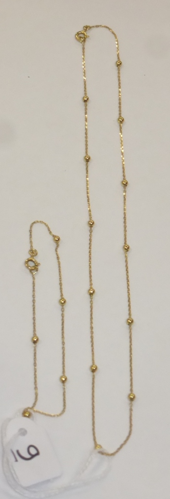 Parure collier et bracelet en or jaune 18k à chaines alternées de boules. L. 40 et 18 cm - PB: 3,6 gr