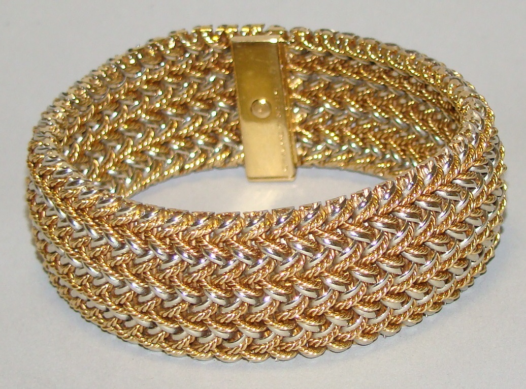 CHAUMET : Bracelet ruban en or de deux tons à décor de tresse. Vers 1960. Signé et numéroté 3796. Poids brut : 120 g.