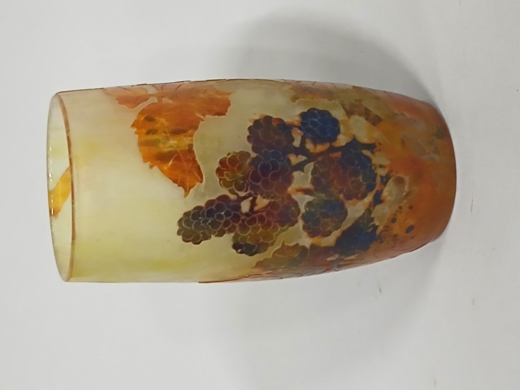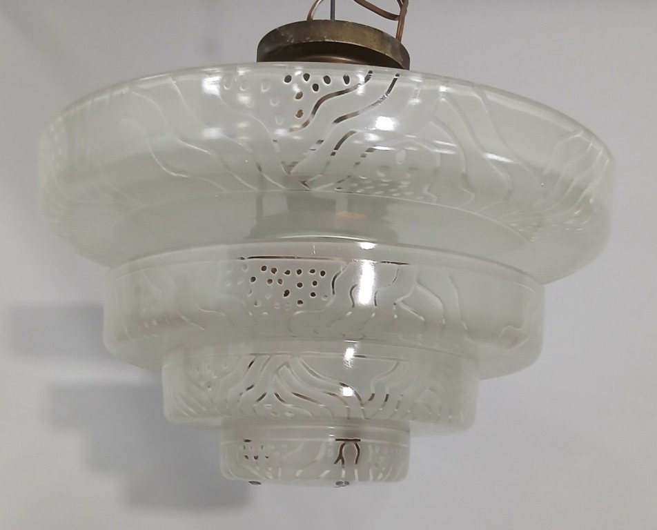 236 Travail FRANCAIS, vers 1930 - Lustre à quatre coupelles concentriques en verre dépoli gravé à l'acide à décor géométrique. H. 36 D.45 cm