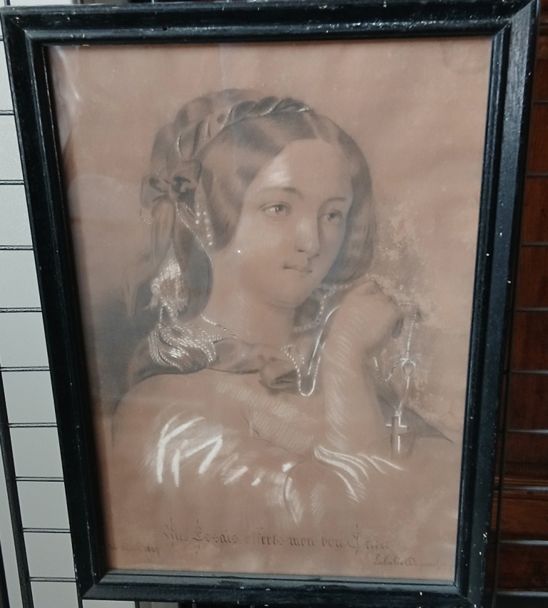 16 Lulali DEGASCHES "Jeune femme tenant un chapelet" Crayon et rehaut de craie, signé en bas à droite, daté 26 août 1847 (petite mouillure en haut à droite). 43 x 28,5 cm