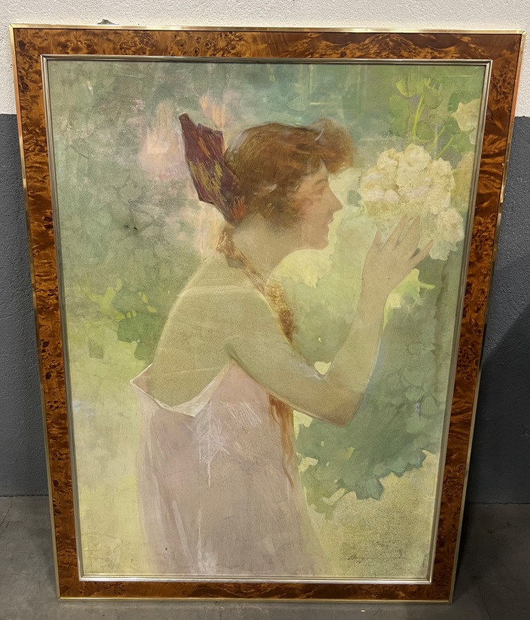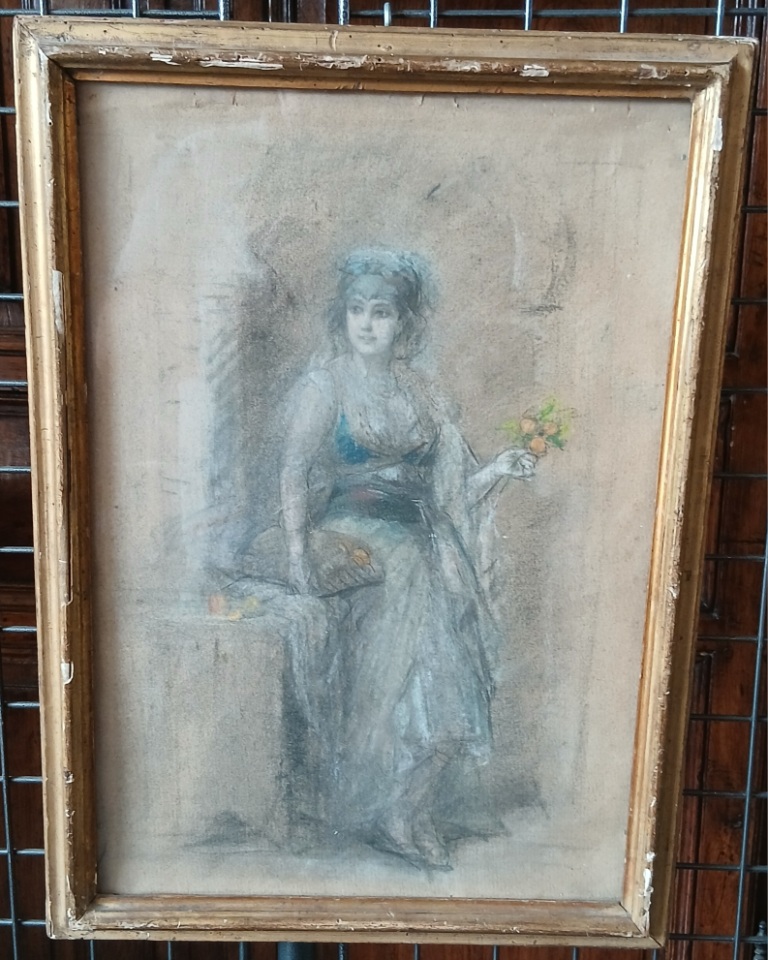 17 Ecole MODERNE, vers 1900 "Jeune femme debout tenant un panier de fruits" Crayon et rehaut de pastel. 47 x 31,5 cm