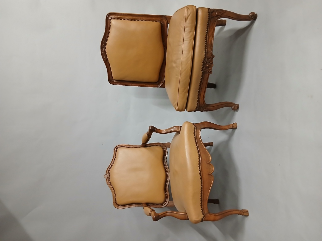 216 Paire de bergères à oreilles et bout de pied en bois sculpté et doré à décor de chutes de piastres et feuillages. Reposent sur des pieds fuselés et cannelés. Recouverts de tapisserie au petit point. Style Louis XVI, vers 1900. Bergères : H. 98 L.