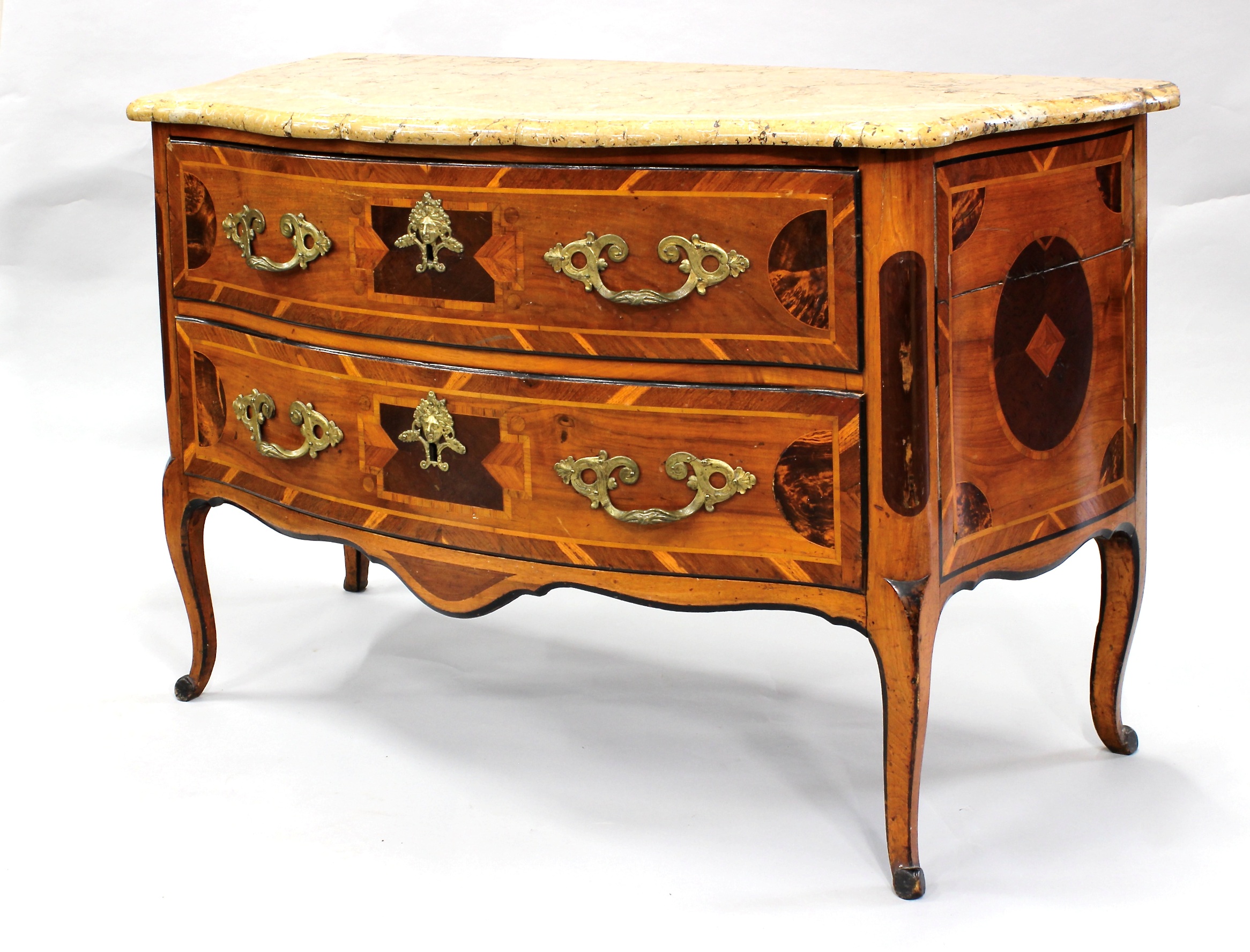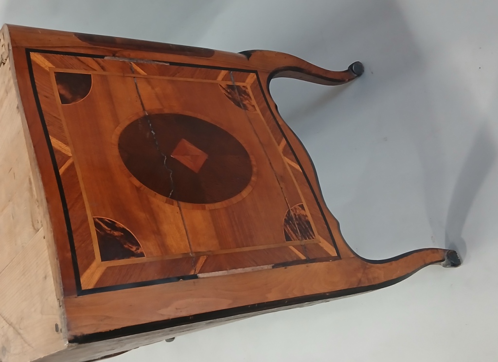 219 Petite commode à léger ressaut en bois de placage et marqueterie à décor de cannelures simulées et croix. Elle ouvre à trois tiroirs. Repose sur des pieds gaine. Dessus de marbre gris veiné. Epoque Louis XVI. (petites sautes au placage) H. 87 L.