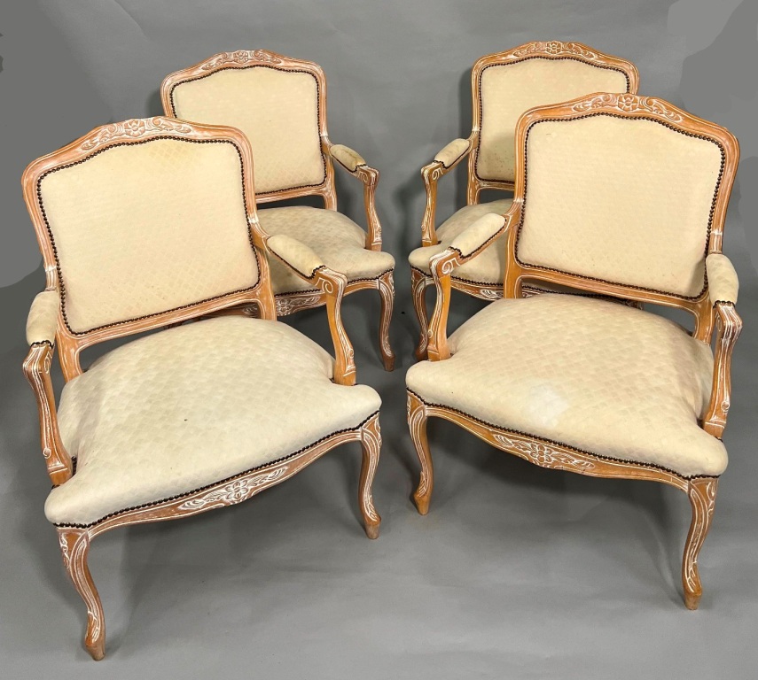 210 Quatre fauteuils en bois cérusé blanc recouverts de tissu écru. Style Louis XV. H. 93 L. 71 P. 63 cm