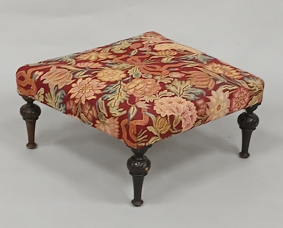 211 Pouf en bois noirci recouvert de tapisserie au petit point à décor de fleurs. XIXe siècle. H. 30 L. 60 P. 60 cm