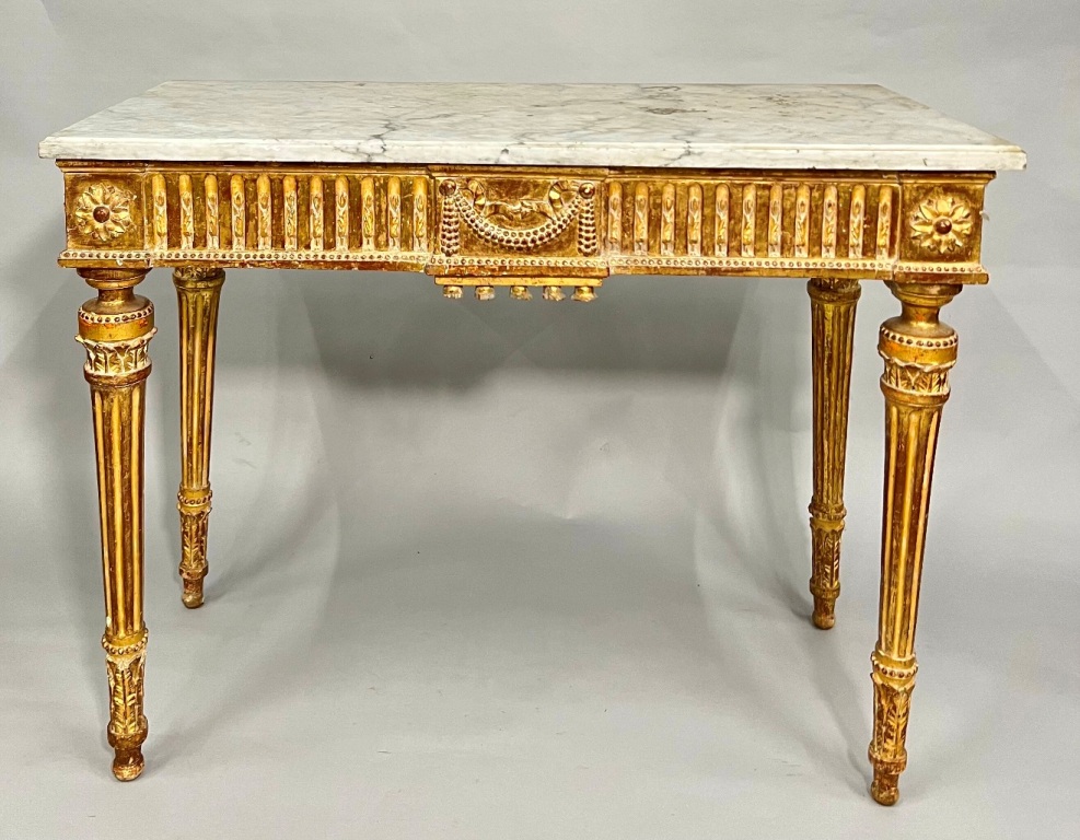 212 Console en bois sculpté et doré à décor de cannelures et guirlandes. Pieds fuselés, cannelés. Dessus marbre blanc veiné. Epoque Louis XVI. H. 90 L. 118 P. 57 cm