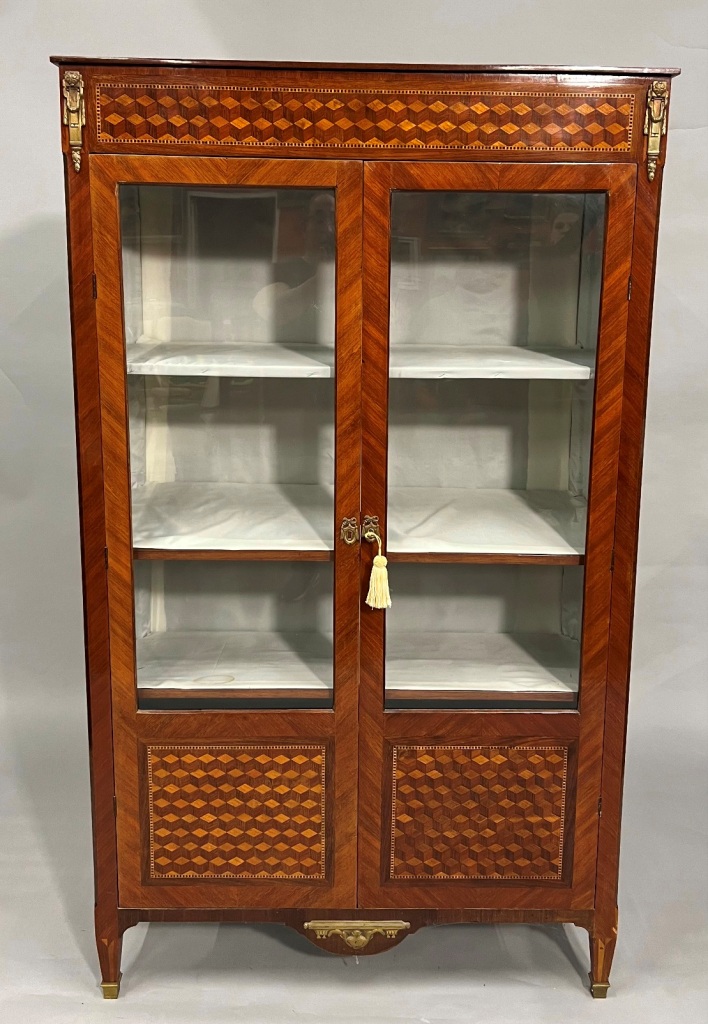 215 Bibliothèque en bois de placage et marqueterie à décor de cube sur la pointe ouvrant à deux portes vitrées. Repose sur des pieds gaine. Style Transition. H. 112 L. 108 P. 40 cm
