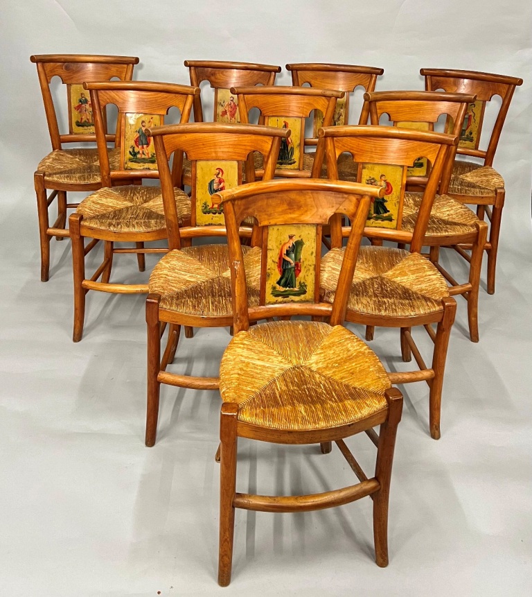 218 Dix chaises en bois à dossier peint à décor de dieux et déesses du Panthéon Romain (Jupiter, Diane, Mars). Assises paillées. Epoque Directoire. H. 87 cm