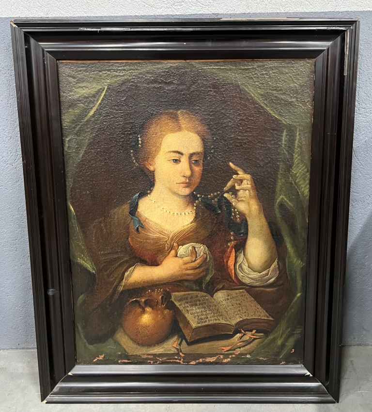 22 Suiveur de NETSCHER, XVIIIe siècle "Jeune femme au collier de perles" Huile sur toile (manques sur le bas) 81 x 63 cm