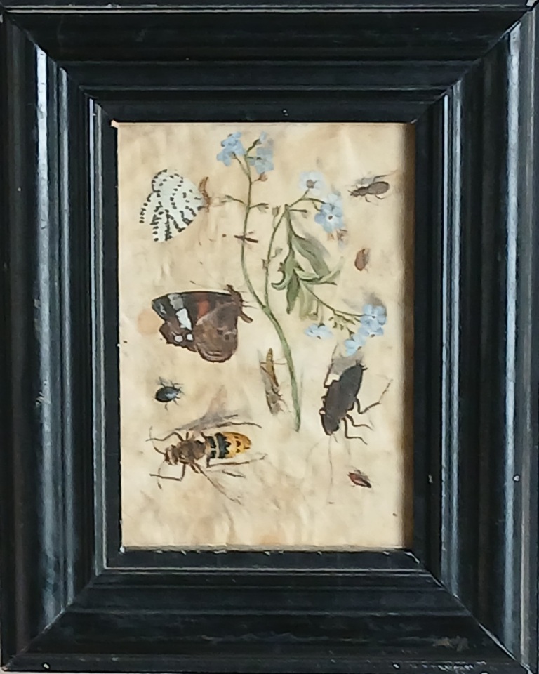 23 Ecole du NORD "Nature morte, papillons et insectes" Gouache sur vélin marouflé sur papier. 16 x 21 cm