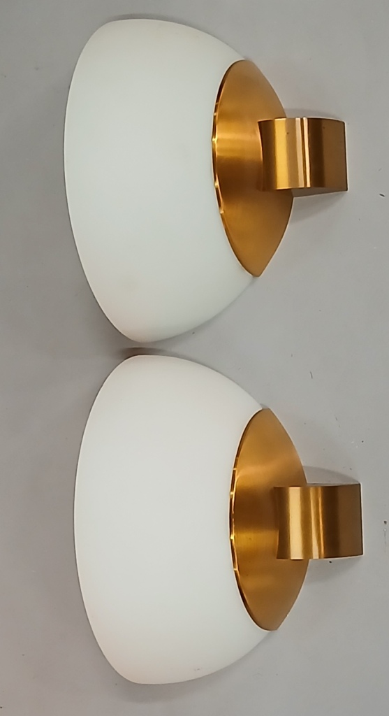 231 J. PERZEL et Atelier - Paire d'appliques demi-lune modèle "540" en cuivre brossé et verre givré blanc. Signées. H. 19,5 L. 29 P. 15 cm