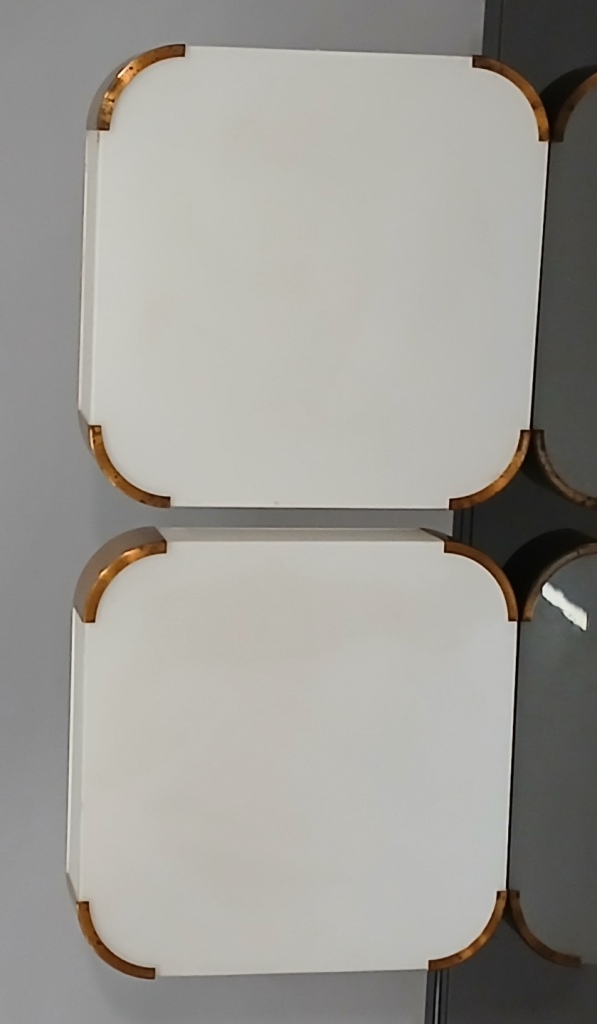 233 J. PERZEL et Atelier - Paire de plafonniers carrés à angles arrondis en cuivre brossé et verre givré blanc. Signés sur le laiton. 42 x 42 cm P. 11,5 cm