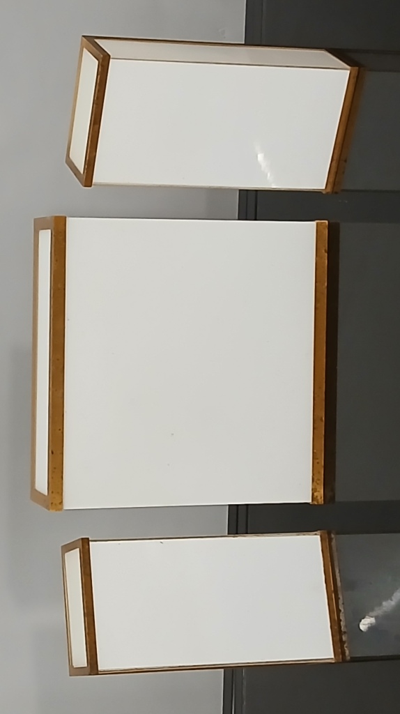 234 J. PERZEL et Atelier - Ensemble comprenant une paire d'appliques rectangulaires et un plafonnier carré au même modèle en cuivre brossé et verre givré blanc. 30 x 15 cm et 33 x 33,5 cm
