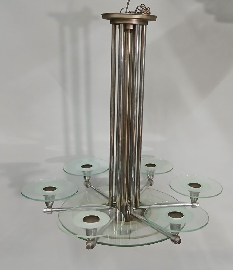 238 Travail FRANCAIS, vers 1930 - Grand lustre moderniste en métal chromé et plaques de verre circulaires, transparentes et givrées au centre à six lumières. Il est soutenu par un fût central entouré de six tubes chromés d'où s'échappent les six lumi