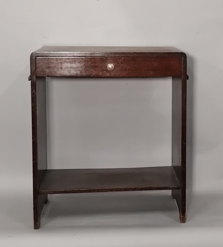 239 Travail FRANCAIS, vers 1930 - Petite table de salon en bois teinté ouvrant à un tiroir. Deux prises sur les côtés. Une tablette d'entrejambe. H. 70 L. 60 P. 35 cm