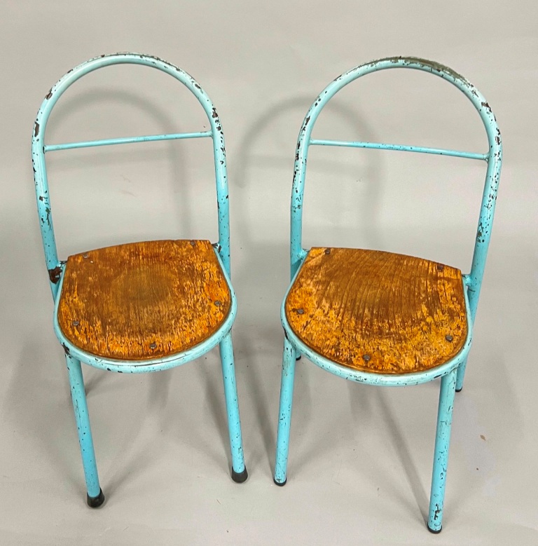240 René HERBST (1891-1982) Paire de chaises enfant en tube de métal laqué bleu et assises en bois multiplis (sautes de peinture). H. 71,5 L. 35 P. 37 cm