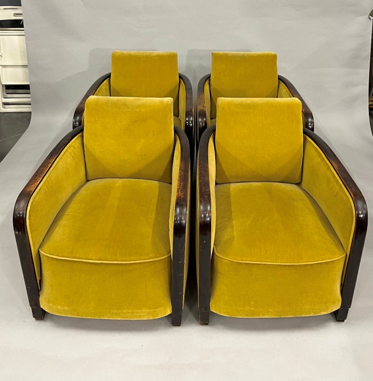 241 Travail FRANÇAIS, vers 1930 - Quatre fauteuils confortables en bois teinté. Profondes assises et dossiers débordant carré, recouverts de velours jaune. H. 75 L. 66 P. 80 cm