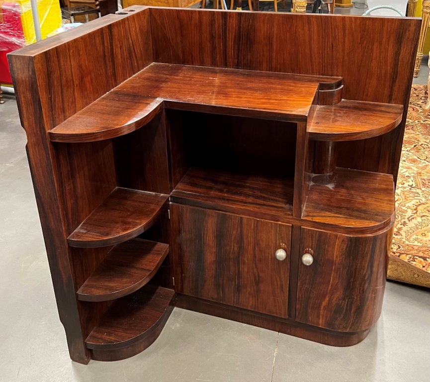 242 Travail FRANÇAIS, 1930 - Meuble d'angle moderniste en bois de placage de palissandre à plateaux et étagères asymétriques. Large niche au centre surmontant deux portes dont une arrondie. Deux prises à boules en métal nickelé. Vers 1930. H. 104 L