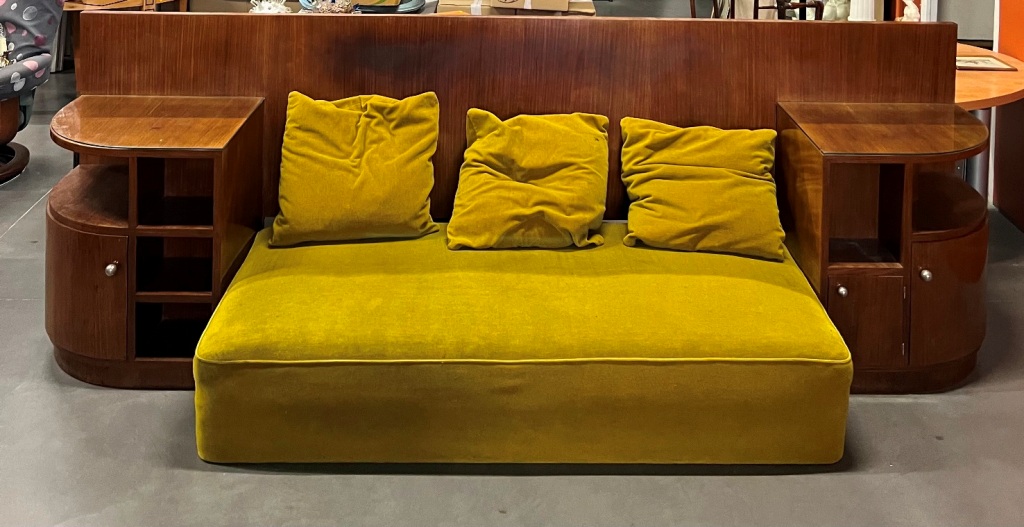 243 Travail FRANÇAIS, 1930 - Large canapé de boiserie moderniste en bois de placage comprenant une assise rectangulaire et des coussins en velours moutarde entouré de deux petits meubles en demi-lune ouvrant l'un à trois niches, une porte arrondie et