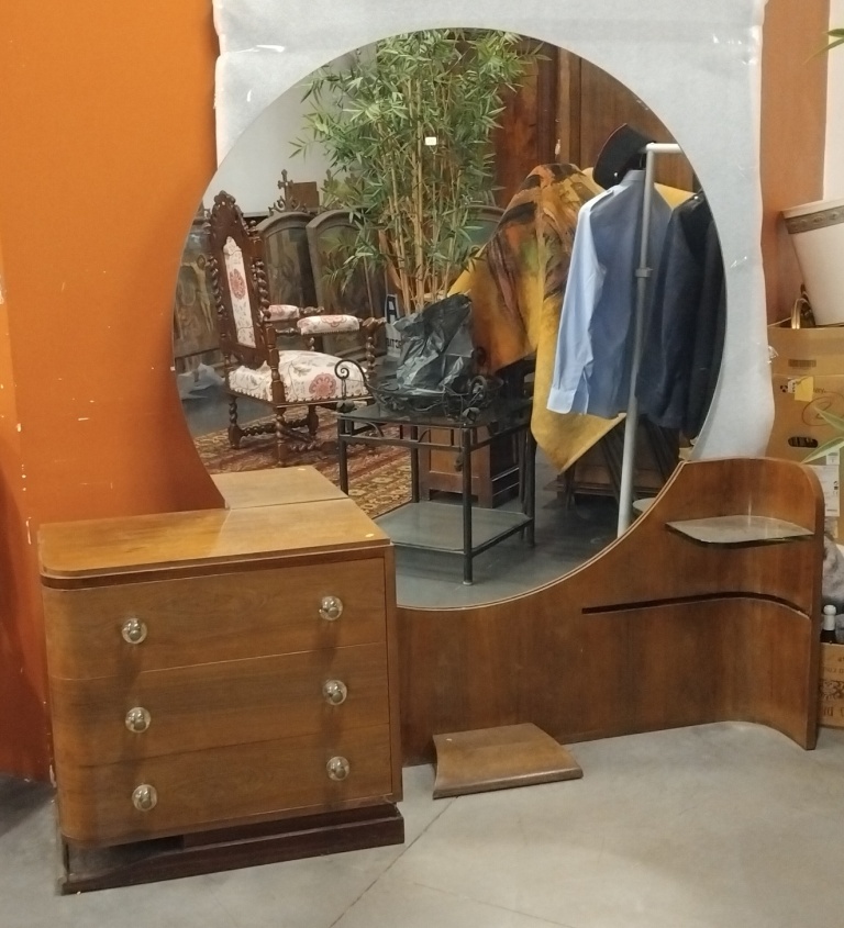 248 Coiffeuse moderniste en bois de placage ouvrant à trois tiroirs à poignées en boule de verre et deux étagères. Grand miroir rond en partie centrale. Vers 1930-1940. H. 173 L. 181 P. 40 cm