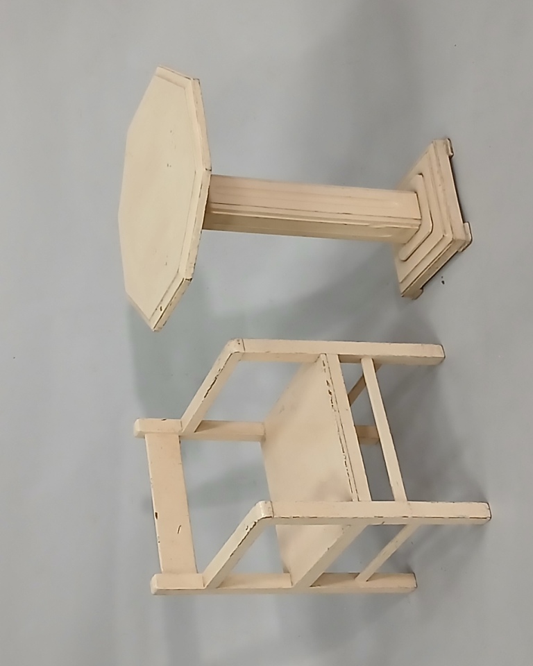 249 Travail FRANÇAIS, vers 1930 - Fauteuil enfant moderniste et guéridon en bois laqué crème. Fauteuil H. 53 cm et guéridon H. 95 cm.