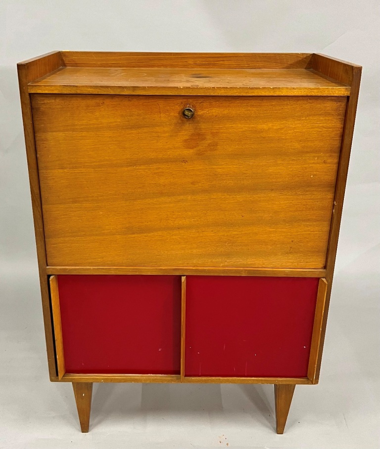 250 Travail FRANÇAIS, vers 1950 - Petit secrétaire à abattant en bois de placage. Plateau à galerie pleine. Il ouvre à un abattant découvrant trois range-dossiers, une étagère, une niche et un petit tiroir. Il ouvre en partie basse à deux portes coul