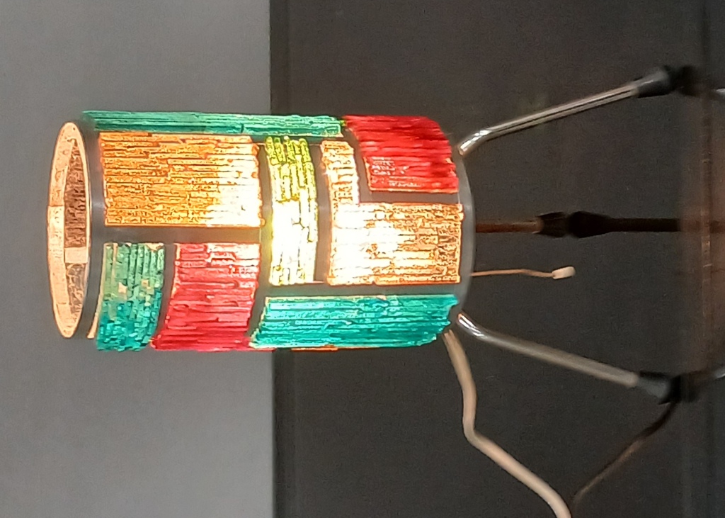 266 Robert POULET (1929-2021) - Lampe à poser cylindrique en plexiglas ornée d'éclats de verre de couleur et de bandes d'aluminium. Repose sur trois pieds chromés. H. 33 cm Prov. Atelier de l'artiste.
