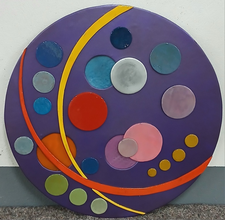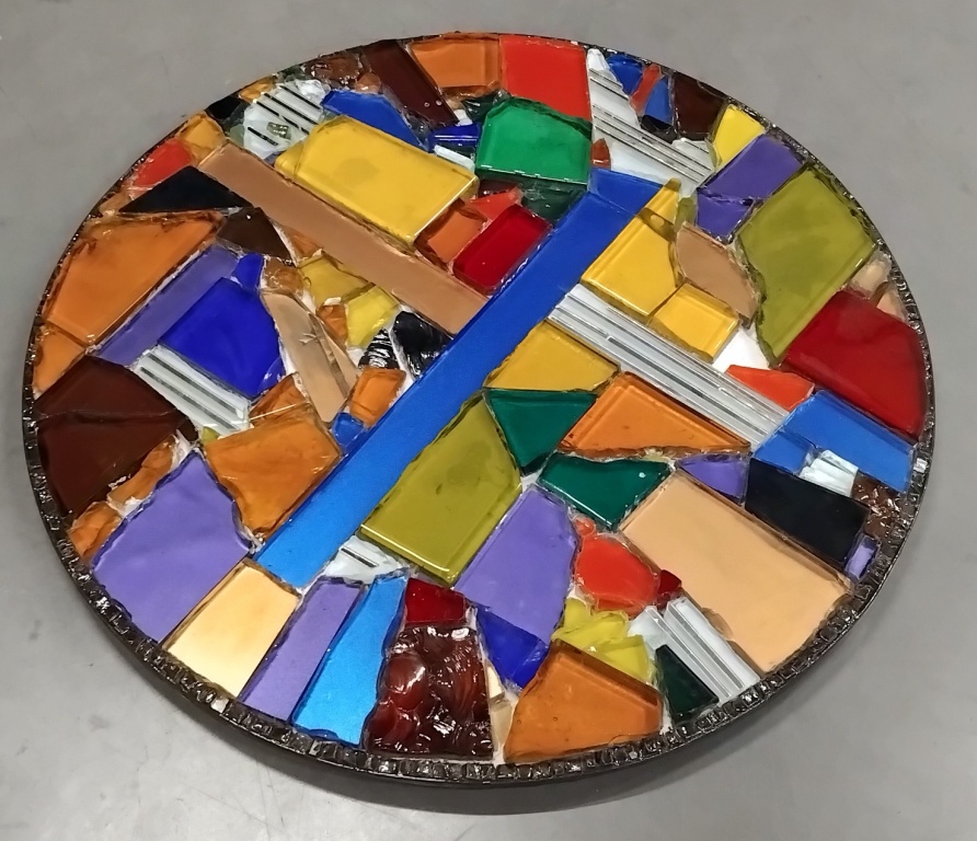 272 Robert POULET (1929-2021) - Tableau-sculpture rond en résine et marqueterie d'éclats de dalles de verre de couleur à décor abstrait. Diam. 80 cm Prov. Famille de l'artiste.