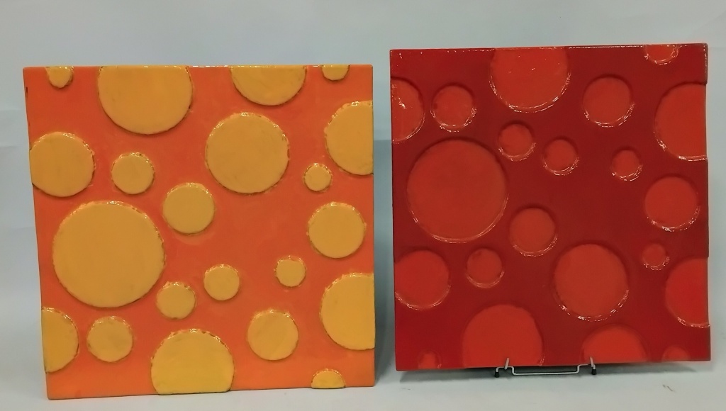 269 Robert POULET (1929-2021) - Paire de tableaux carrés en résine en relief à décor de ronds orange et jaunes. 59,5 x 59,5 cm Prov. Famille de l'artiste.