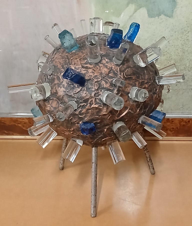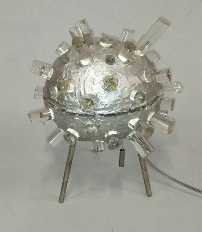 273 Robert POULET (1929-2021) - Lampe-Sculpture ronde "Spoutnik" en béton armé patiné cuivre orné de barreaux de verre transparent et d'éclats de dalle de verre de couleurs. Repose sur un piétement tripode en acier. Vers 1970 H. 28 cm Prov. Famille d