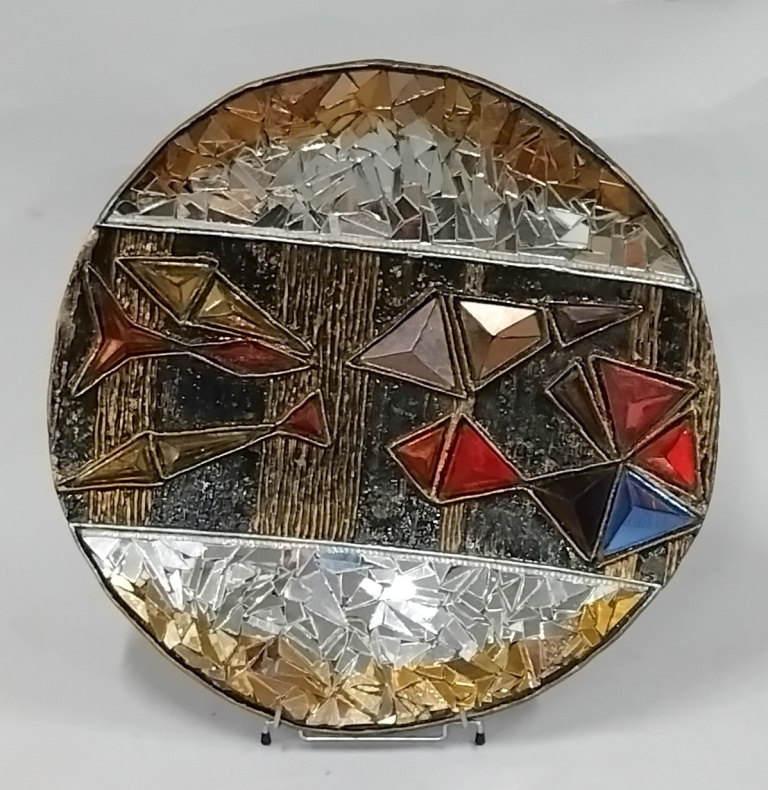 275 Robert POULET (1929-2021) - Tableau rond concave en résine en miroir et pyramides en verre antique de couleurs. cm Prov. Famille de l'artiste.