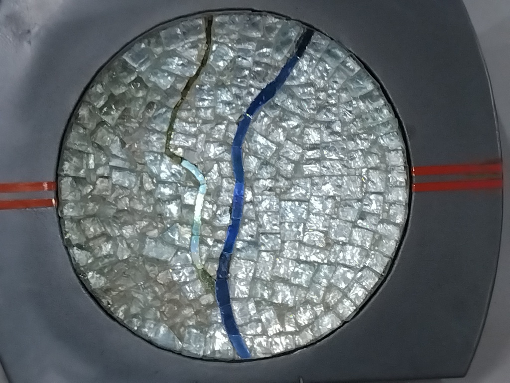 276 Robert POULET (1929-2021) - Tableau rectangulaire à bords arrondis en résine marron, bandes rouges et éclats de dalles de verre transparent et miroirs bleus et verts représentant la Confluence du Rhône et de la Saône dans un cercle. Signé et daté