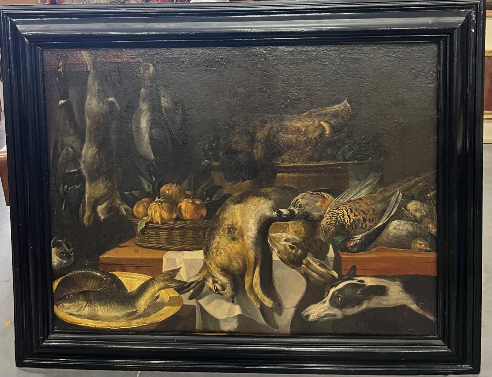 34 Ecole ESPAGNOLE, vers 1650, entourage de BARRERA "Nature morte au lièvres, faisans et tête de sanglier" Huile 104 x 140 cm