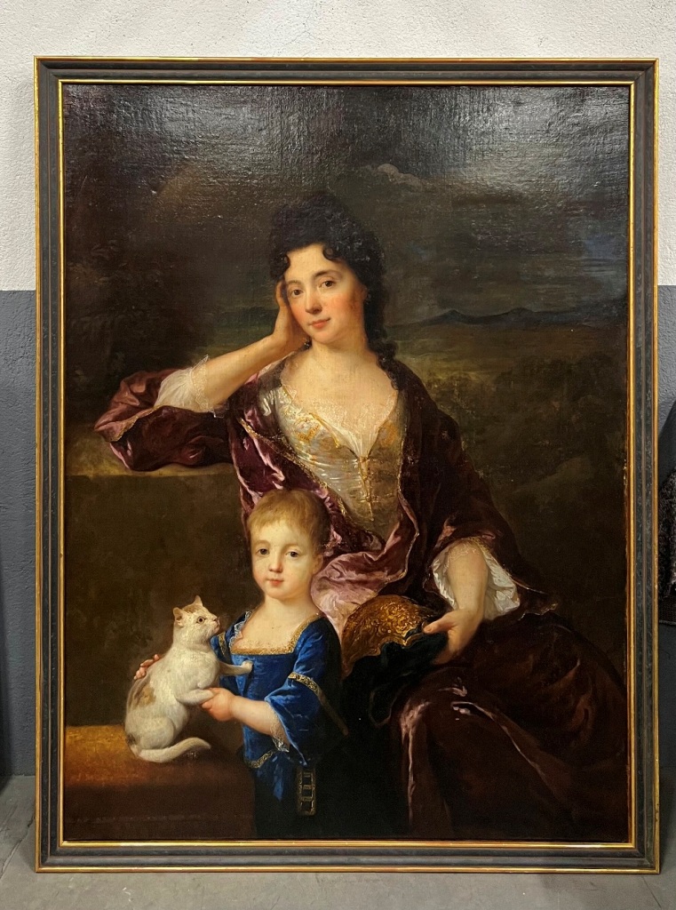 35 Attribué à Jean François de TROY "Portrait de femme et son enfant jouant avec un chat" Huile (restauration, rentoilée, une pièce) 130 x 98 cm