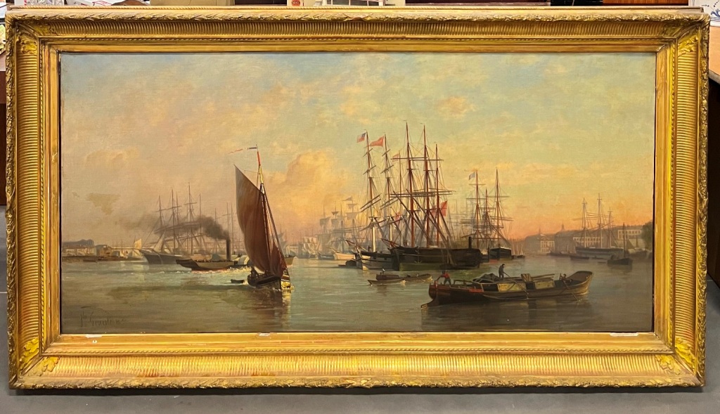 214 Trumeau provençal en bois rechampi et doré à décor d'une huile sur toile représentant une scène de marine animée de l'école du peintre Charles François Lacroix de Marseille. 230 x 127 cm Epoque Louis XVI. 230 x 127 c