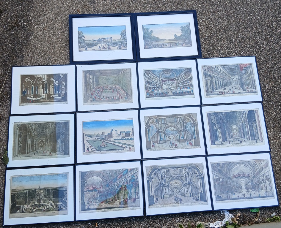 6 Ecole ANGLAISE du début XIXe siècle "Vues de monuments" 12 vues d'optique en couleurs On joint trois vues d'optique : deux à décor de jardins de châteaux et une d'un temple chinois.