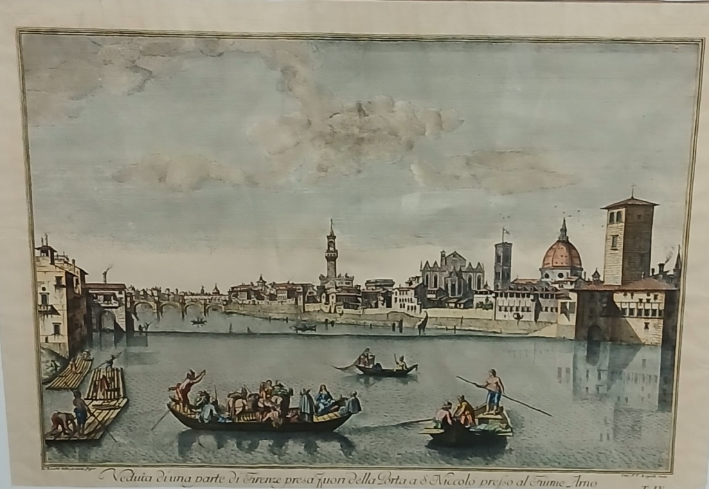 7 Travail ITALIEN du XIXe siècle "Vue de Florence et de l'Arno". Grande vue d'optique en couleur, dessinée et gravée par ZOCCHI. Editée par B.S GRILLI. XIXe siècle. 43 x 62 cm
